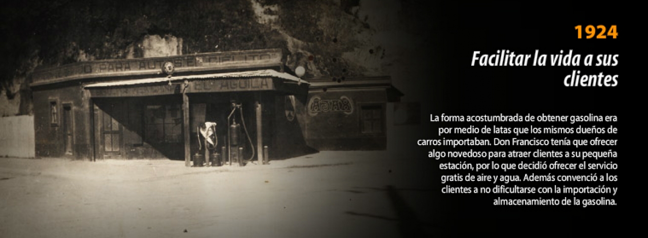 La forma acostumbrada de obtener gasolina era por medio de latas que los mismos dueños de carros importaban. Francisco tenia que ofrecer algo novedoso para atraer clientes a su pequeña estación, siendo entonces el primero en la ciudad de Guatemala en ofrecer el servicio gratis de aire y agua, del cual nunca se había oído antes y a la vez convencía a los clientes a no dificultarse con la importación y almacenamiento de la gasolina.